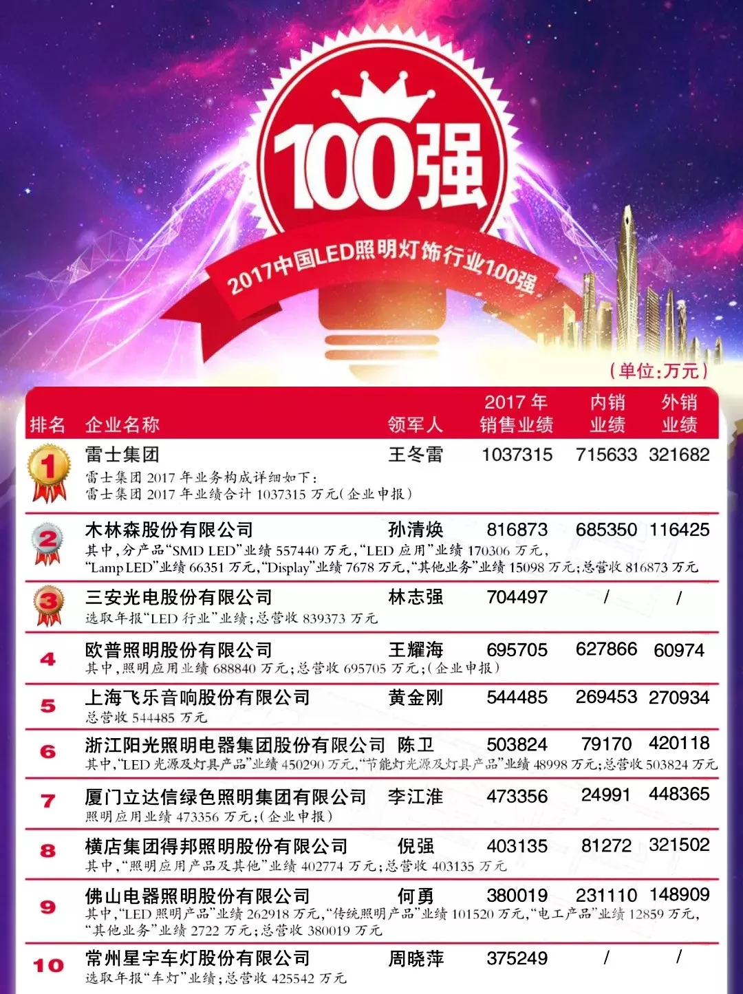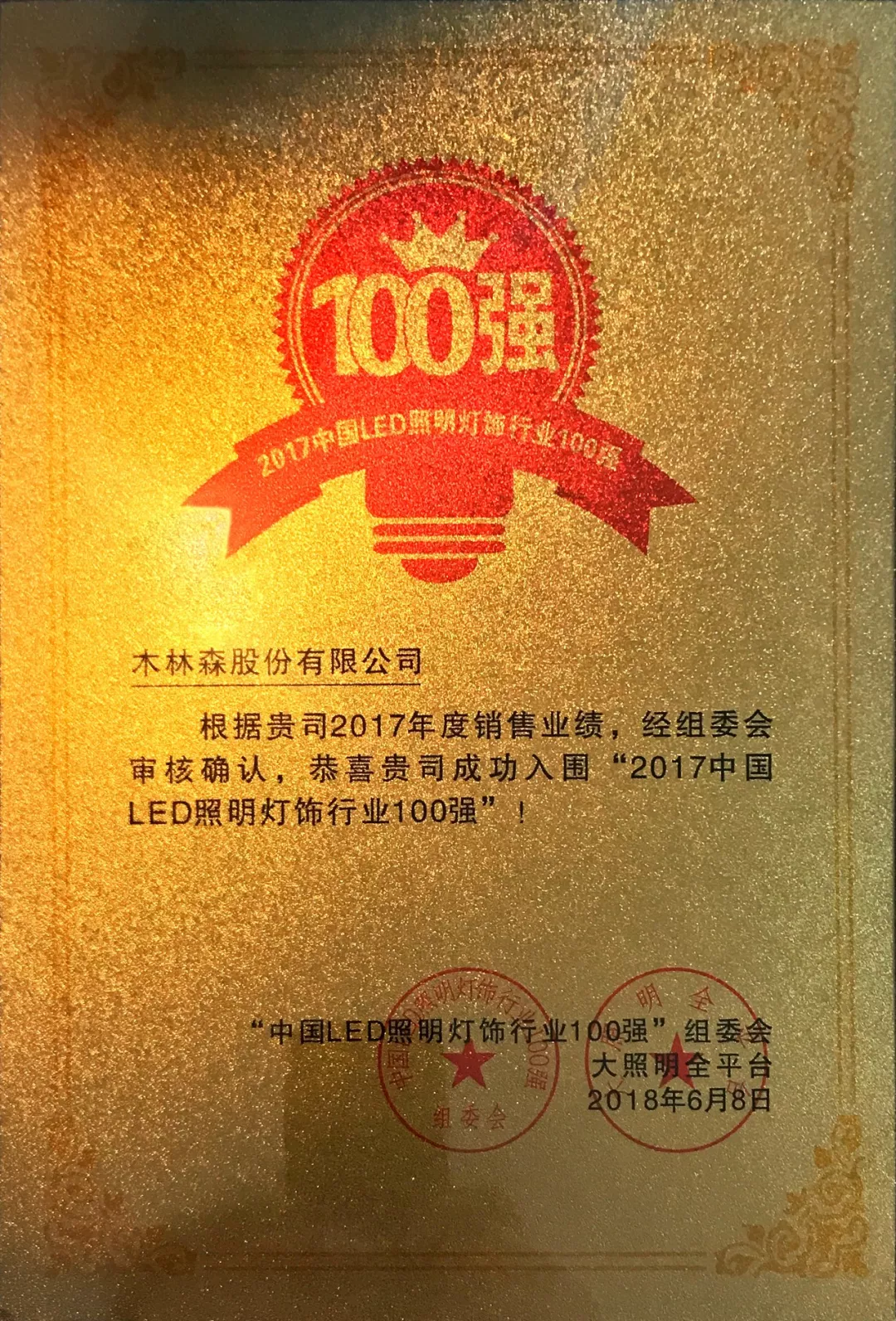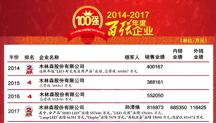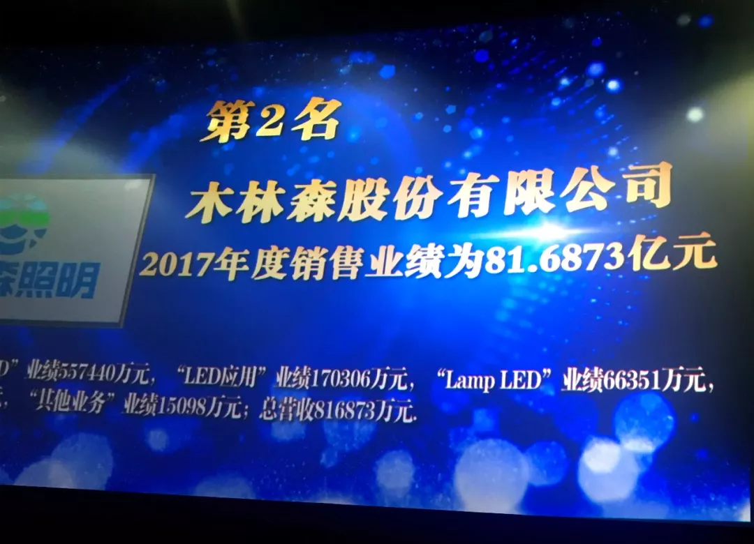 6月8日下午,广州塔上“2017中国LED照明灯饰行业100强”(简称“百强榜”)榜单正式揭晓,木林森以“2017年销售业绩81.69亿元”位列百强榜第二名。